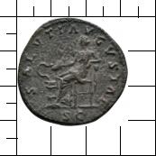 SALVTI AVGVSTAE. Salus thronend n. l., in der rechten vorgestreckten Hand Opferschale (Patera), daraus eine Schlange fütternd, die sich um einen Altar windet, den linken Arm auf Lehne abstützend, im Abschnitt S C; Perlkreis. |