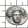Kopf der Nymphe Larisa mit Haarband (Ampyx) in Dreiviertelansicht n. r.; Perlkreis. |