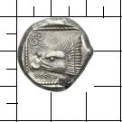 Kopf eines Adlers n. l., im Feld unten Flechtband, im Feld links oben Palmette gerahmt von Spiralen; Perlquadrat in Quadratum Incusum. |