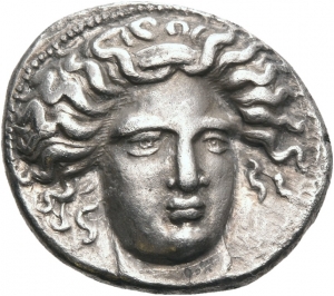 Obverse: Kopf der Nymphe Larisa mit Haarband (Ampyx) in Dreiviertelansicht n. r.; Perlkreis.