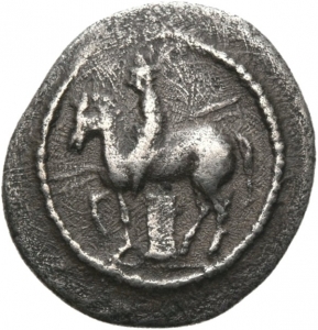 Vorderseite: Reiter mit Hut (Petasos) auf Pferd n. l., in der rechten Hand zwei Lanzen, unter dem Pferd ein Altar; Perlkreis.