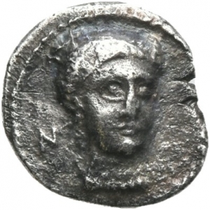 Vorderseite: N. Kopf der Aphrodite mit Perlenhalsband und Sphendone in Dreiviertelansicht n. r.; Perlkreis.